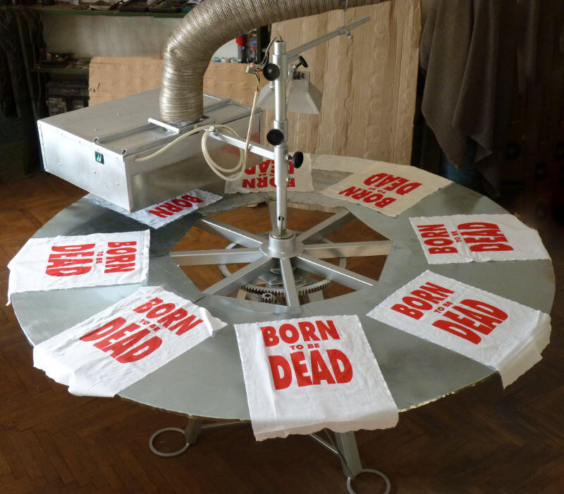 În principiu, materialul destinat uscării, se alimentează ca la imprimare pe un carusel cu mai multe blaturi (în acest caz 8), iar acesta intră (manual sau automat) prin rotire sub unitatea de uscare IR, cu parametrii de timp setați la alegere de către operator.